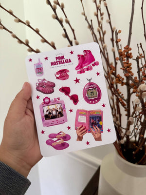Step back into the 2000s with this glittery pink throwback! Featuring Tamagotchis, roller skates, flip phones, jelly sandals, and all the Y2K vibes — this sticker sheet is perfect for junk journaling, planners, pen pal mail, scrapbooking, or decorating anything that needs a pop of retro fun.